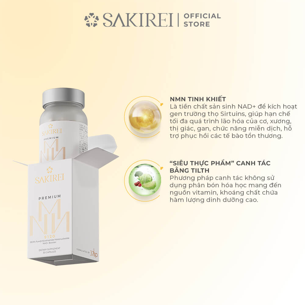 Sakirei Premium NMN 9120 được nghiên cứu và phát triển dựa trên sự hợp tác giữa hai thương hiệu Nhật Bản Sakirei và 37sp, cùng sự đồng hành của đội ngũ chuyên gia hàng đầu trong lĩnh vực chăm sóc sức khỏe và sắc đẹp. Sản phẩm chứa hoạt chất chính là NMN với tổng hàm lượng lên đến 3000mg, kết hợp cùng các loại siêu thực phẩm cung cấp nguồn dưỡng chất dồi dào, hỗ trợ chống lão hóa sớm và nuôi dưỡng làn da đầy sức sống.