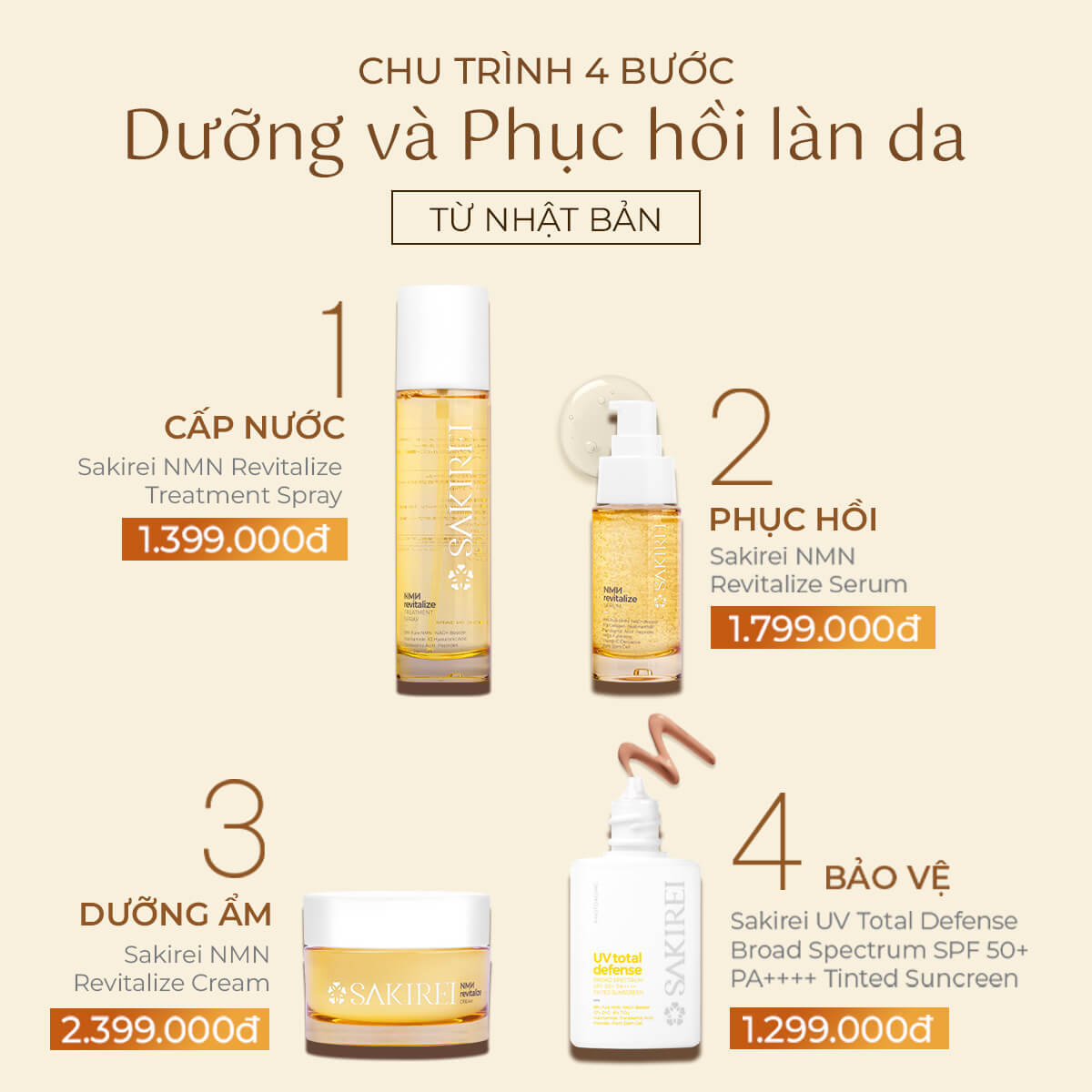 - Cân bằng & Tinh chất: Sử dụng xịt khoáng hoặc toner để cân bằng da, sau đó thoa tinh chất dưỡng chuyên sâu (có thể dùng SAKIREI NMN Revitalize Serum) để cung cấp dưỡng chất.